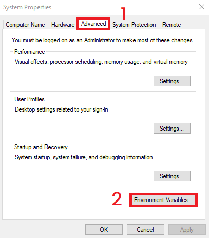 - Go to the Advanced tab and click Environment Variables.