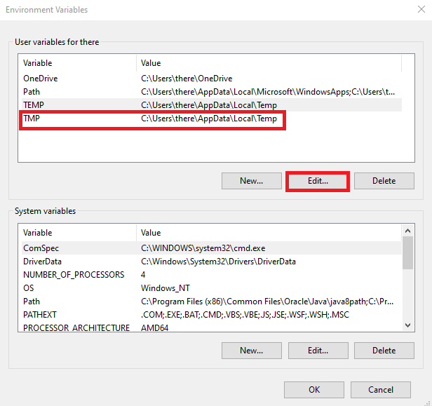 - Under User Variables, select TEMP and click Edit.