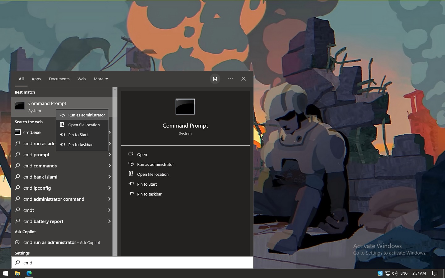 - Press the search icon in the taskbar, then type ‘Command Prompt‘ or ‘cmd‘ and select ‘Run as administrator.‘