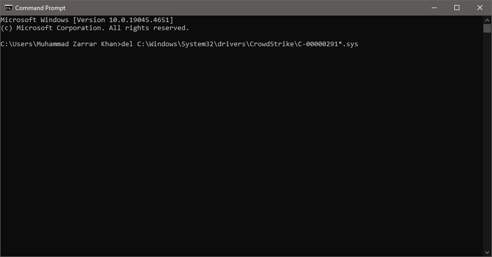Run CMD as administrator - In the Command Prompt type ‘del C:\Windows\System32\drivers\CrowdStrike\C-00000291*.sys’ and press enter.