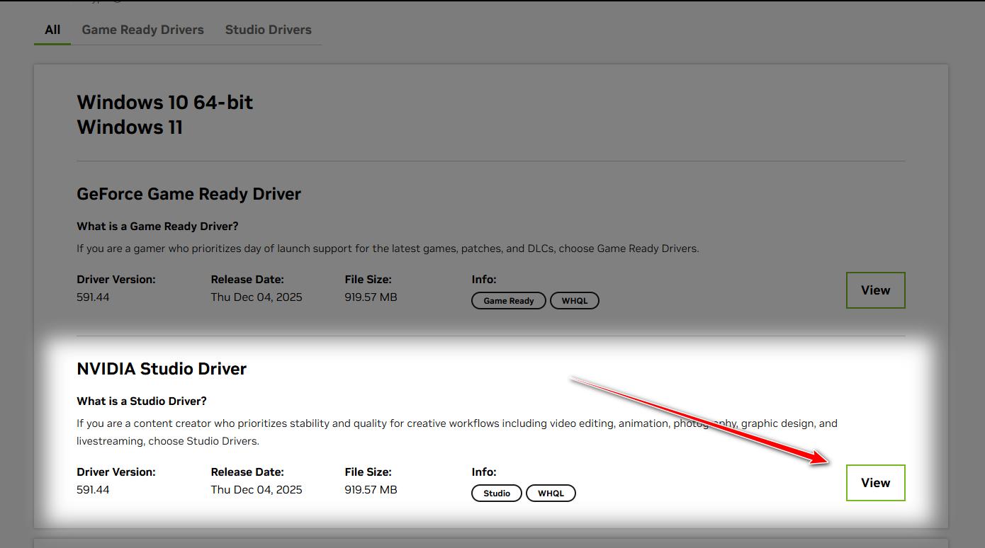 If you’re on an NVIDIA GPU, Studio Drivers are typically tested more against creative workloads (Resolve, Premiere, Blender). Game Ready drivers are optimized for new game releases, but sometimes introduce compute/export bugs that show up as rendering errors. Switching to Studio is one of the fastest “stability-first” moves.