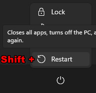 - Hold Shift and click Restart to open the Advanced Start-up menu.