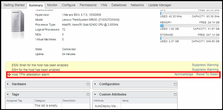 The “Host TPM Attestation Alarm” is a very complex and detailed topic if you get into the nitty-gritty, however, fixing this problem involves just 2 simple checks. Do note that there can be a large number of issues if you’re setting up this feature, such as hashing algorithms, managing many hosts, and whatnot, but they can get extremely specific.