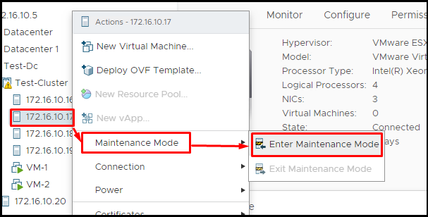 - Once in Maintenance Mode, again right-click on the server. Go to “Connection” and select “Disconnect” as shown. (Credits: VMware)