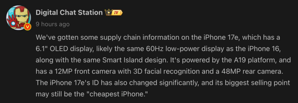 Reliable leaker and insider, Digital Chat Station, has stated that the next budget iPhone, the 17e, will be coming in Spring next year. It is expected to retain the modest $500 price tag, with an upgraded A19 Bionic chip.