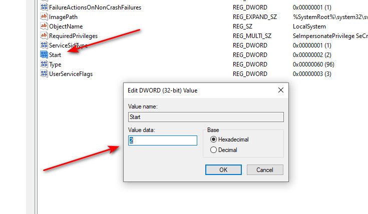 - Double-click Start, set it to 2, click OK.