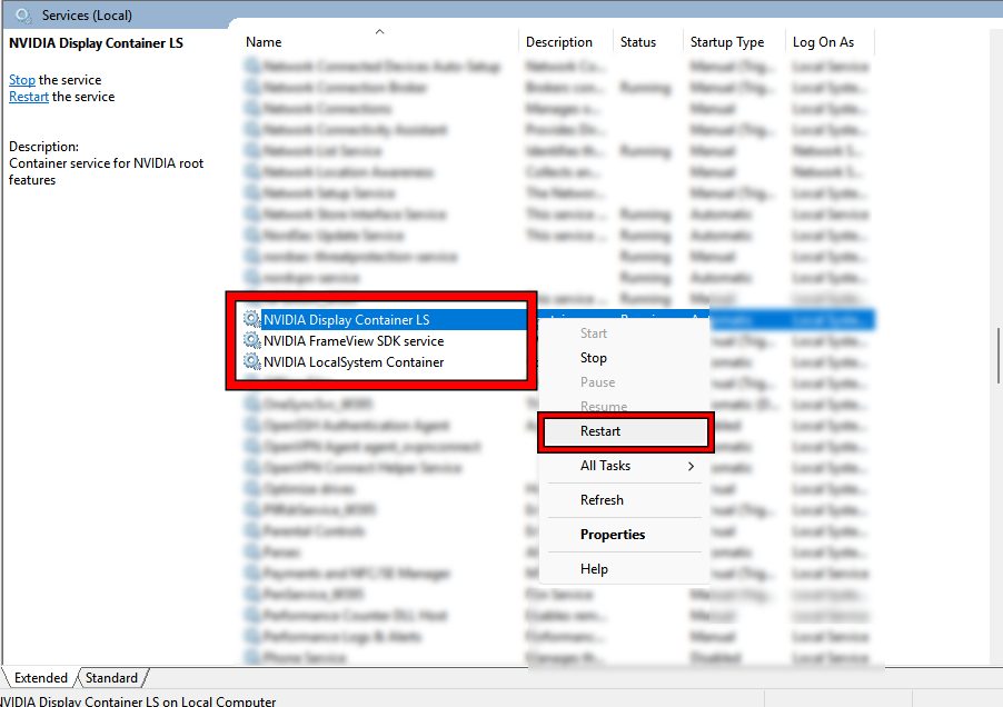 - Restart NVIDIA services (commonly NVIDIA Display Container LS plus any NVIDIA LocalSystem/NetworkService Container entries).