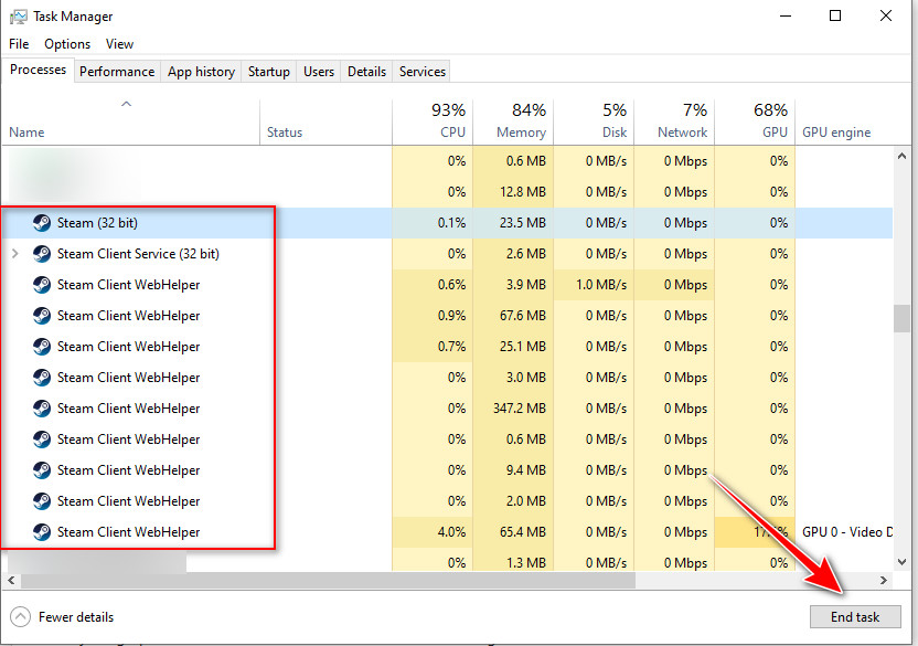 - Open Task Manager and end steam.exe and steamwebhelper.exe (any Steam-related process).