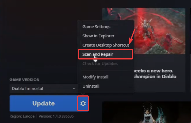 - Click the Gear icon next to the Play button and choose Scan and Repair.