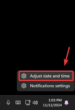 - Right-click the date and time on your taskbar, then select Adjust date and time.