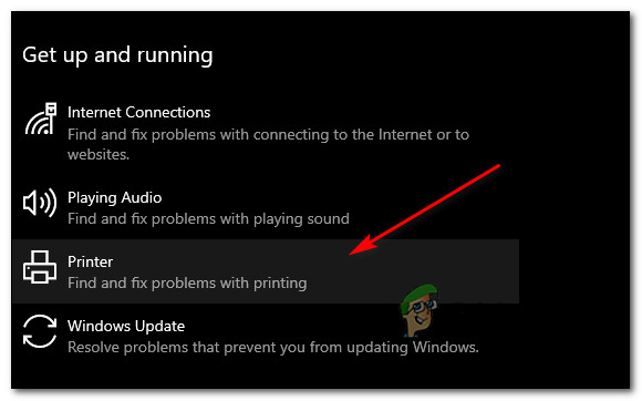 Opening the Troubleshooting tab on Windows 10 - On the right side, scroll down and click on the Printer icon under the Get up and running section.