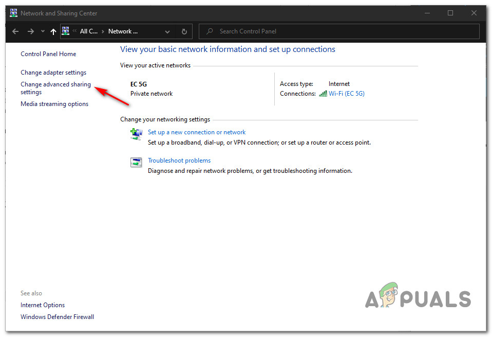 Opening the Network sharing tab - Click Change advanced sharing settings in the left menu.