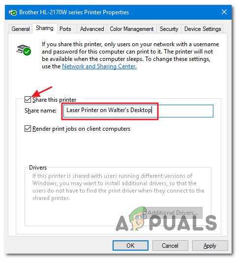 - In the Printer Properties window, open the Sharing tab and tick Share this printer.