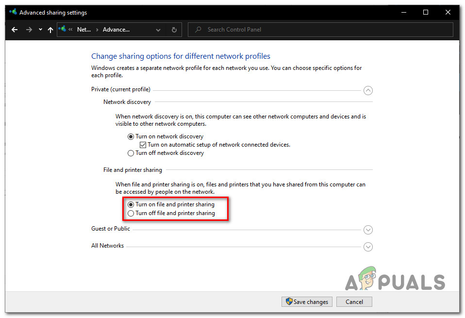 Turn on Printer Sharing - Click Save changes and confirm any User Account Control (UAC) prompts. Finally, restart your computer.
