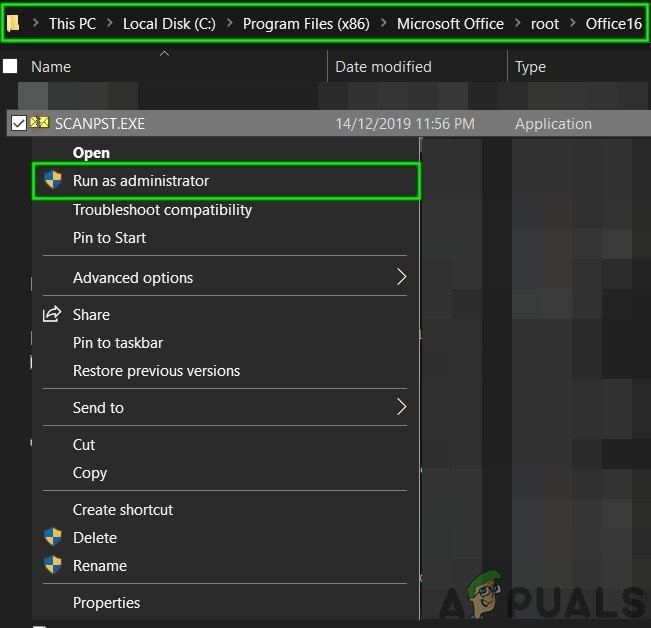 - In the Office folder, find SCANPST.EXE, right-click it, then select “Run as Administrator”.