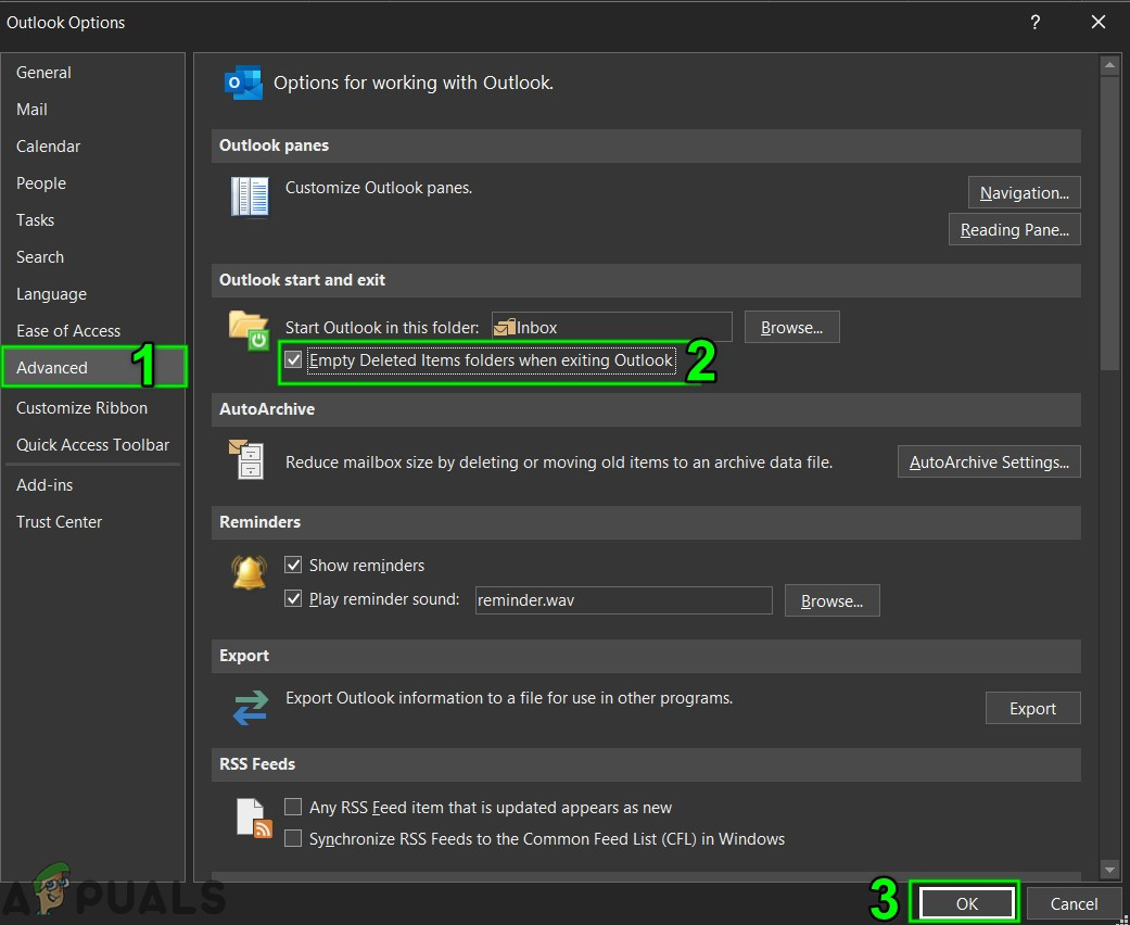 Open Outlook Options - Go to Advanced. In the right pane under Outlook start and exit, check ‘Empty Deleted Items folders when exiting Outlook‘.