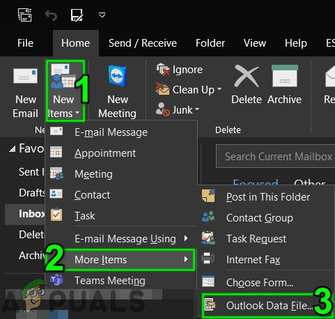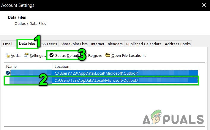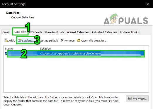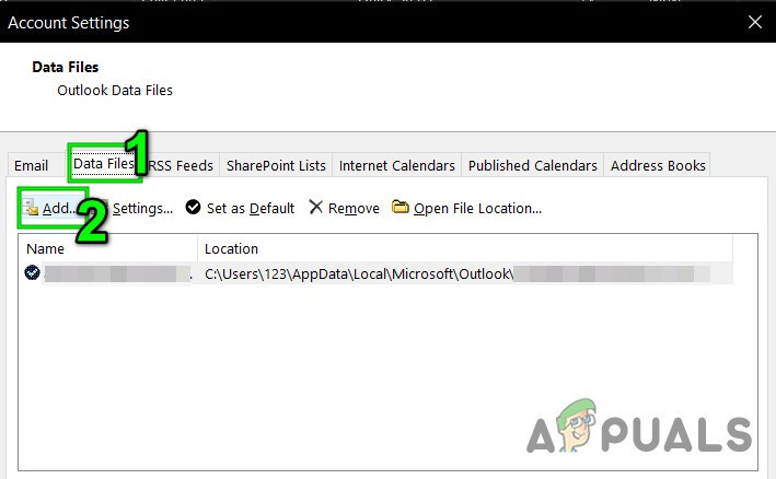 Account Settings of Outlook - Go to the Data Files tab and click Add.