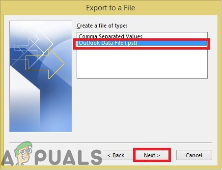 Export to a File in Import and Export Wizard - Select Outlook Data File (.pst) and click Next.
