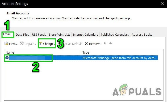 Run Update Now of Outlook - Go to the Email tab, select your account, and click Change.