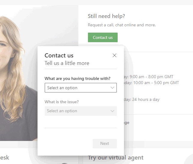 - Go to the Contact Us Page and click on Contact Us (under Still Need Help).