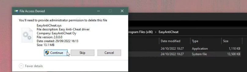 - Alternatively, right-click on the “EasyAntiCheat.sys” file and choose “Delete”.
