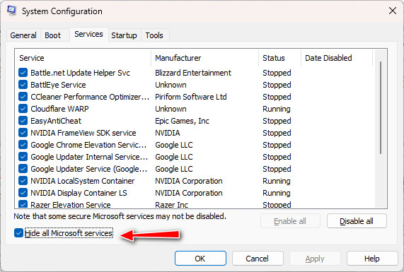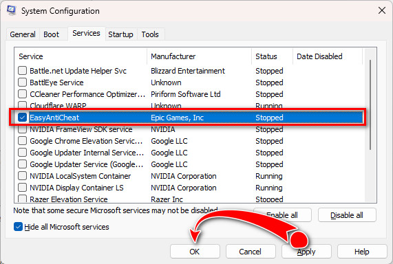 This process minimizes software conflicts with Easy Anti-Cheat. Once the game is running correctly, you can gradually re-enable the services using the same msconfig window to identify any conflicting services.