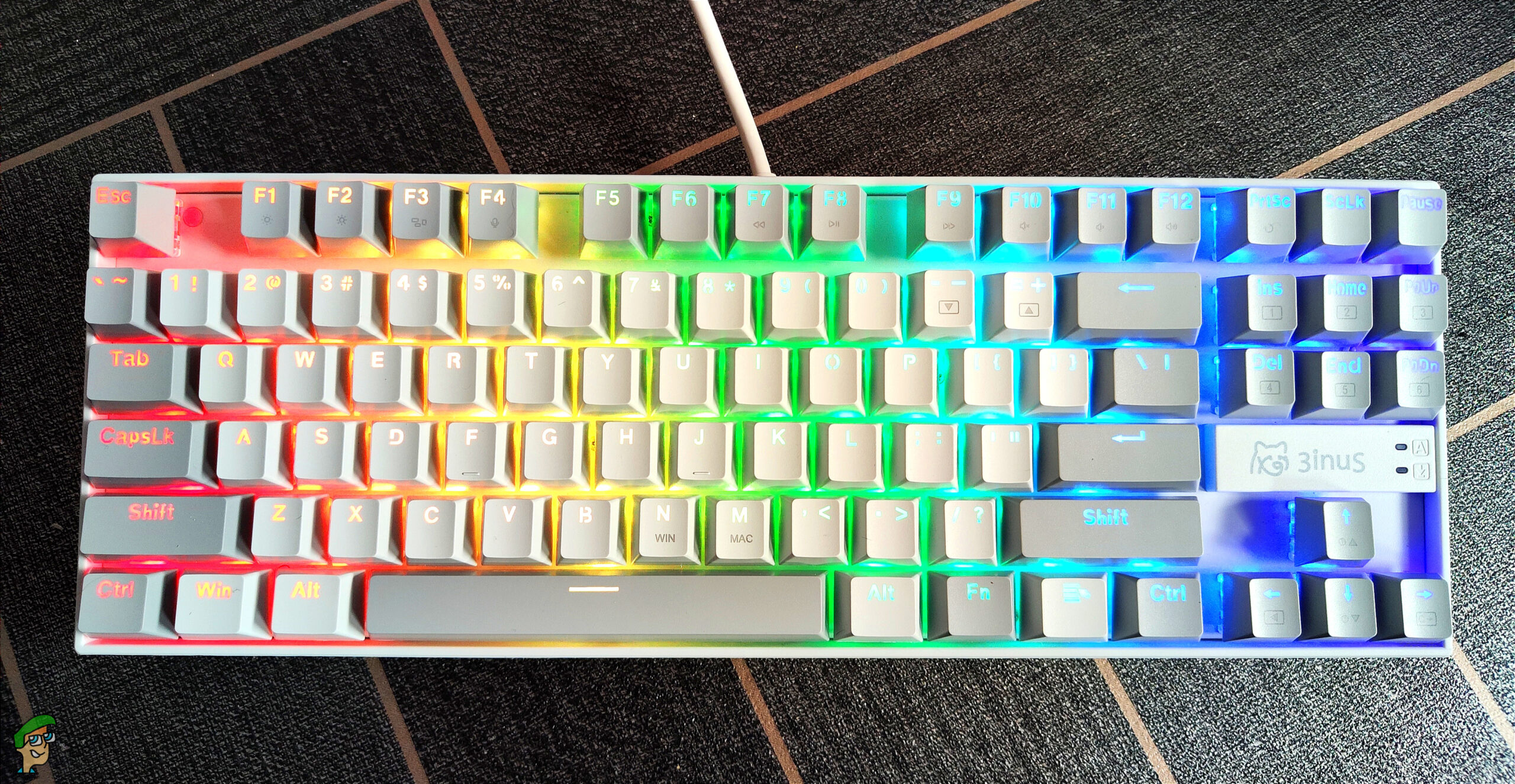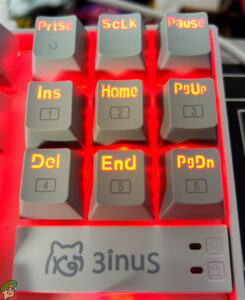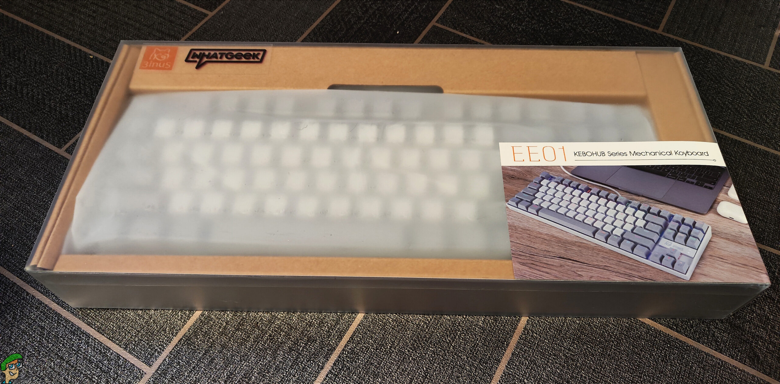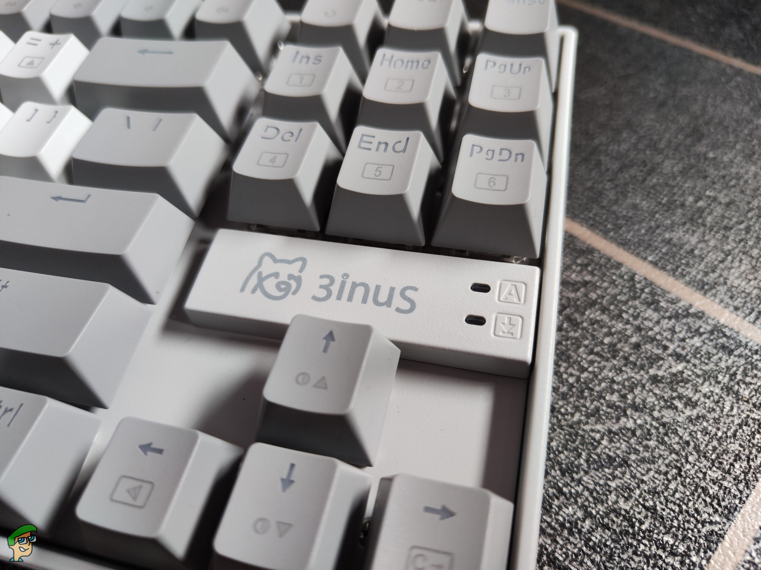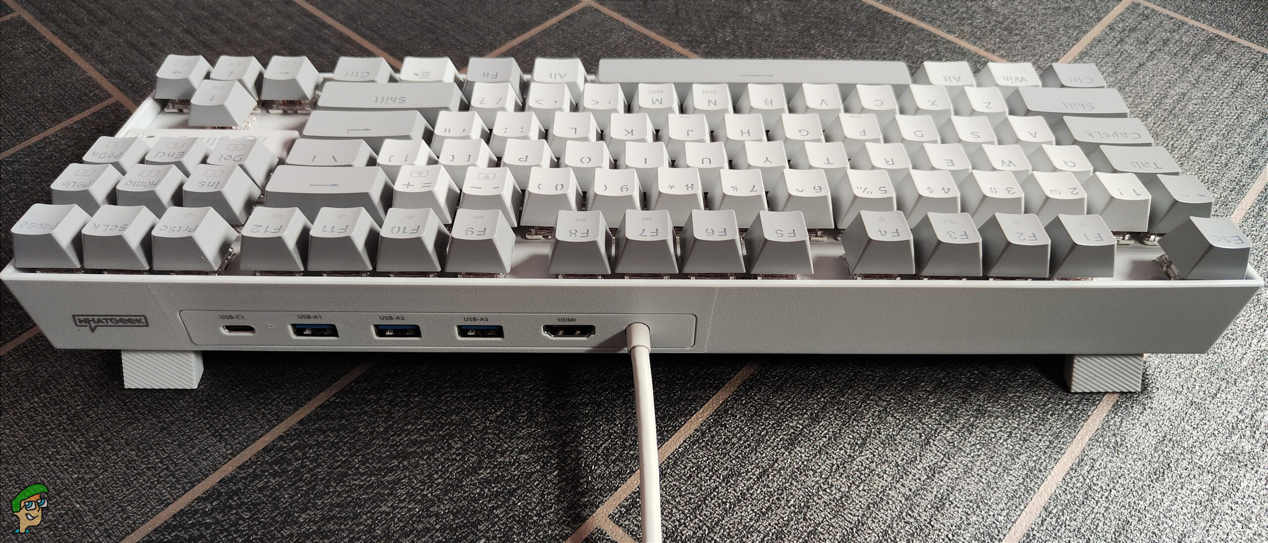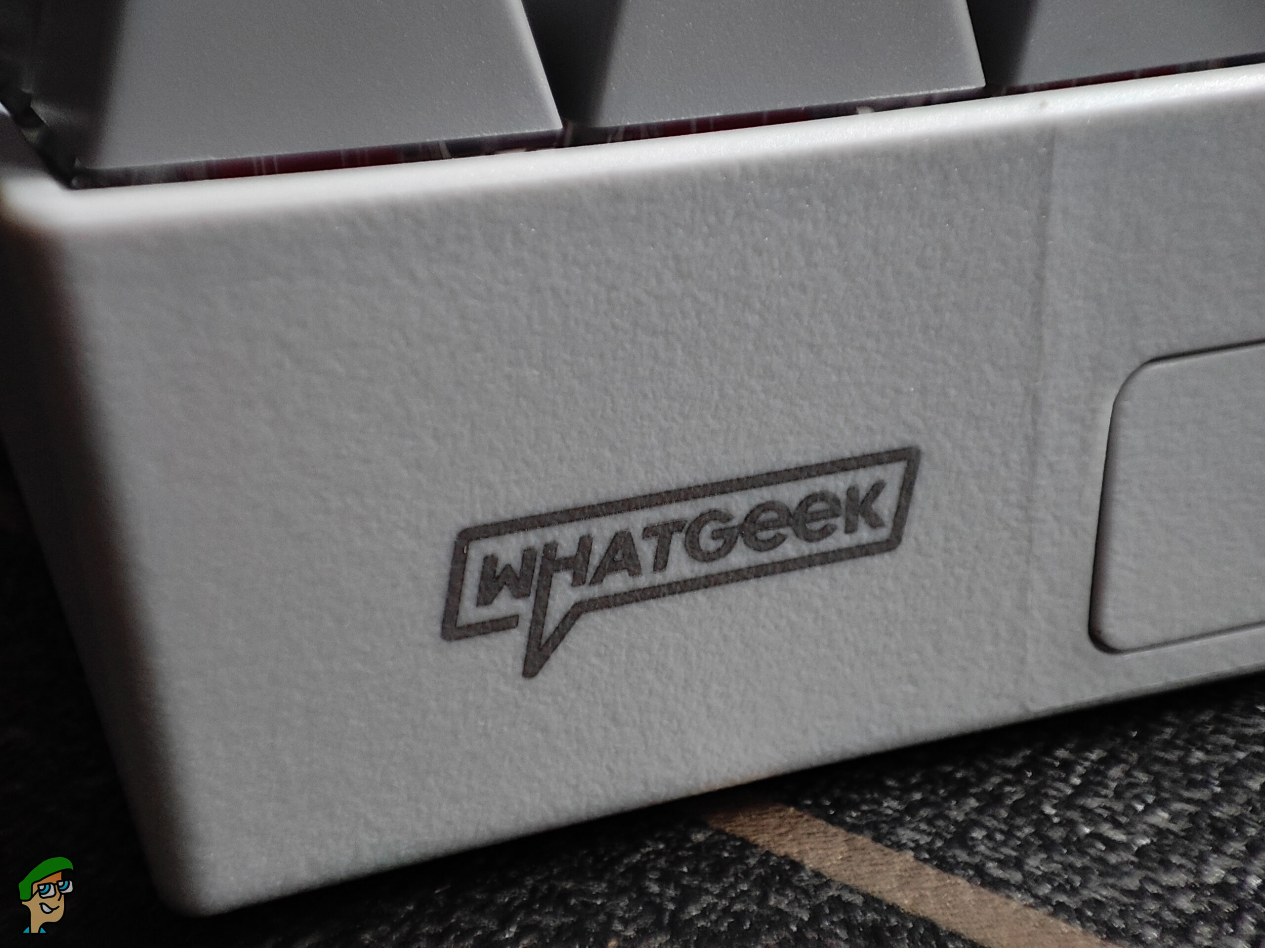We have the 3inus branding above the arrow keys, the keyboard name on the front left, and the WhatGeek branding on the rear.
