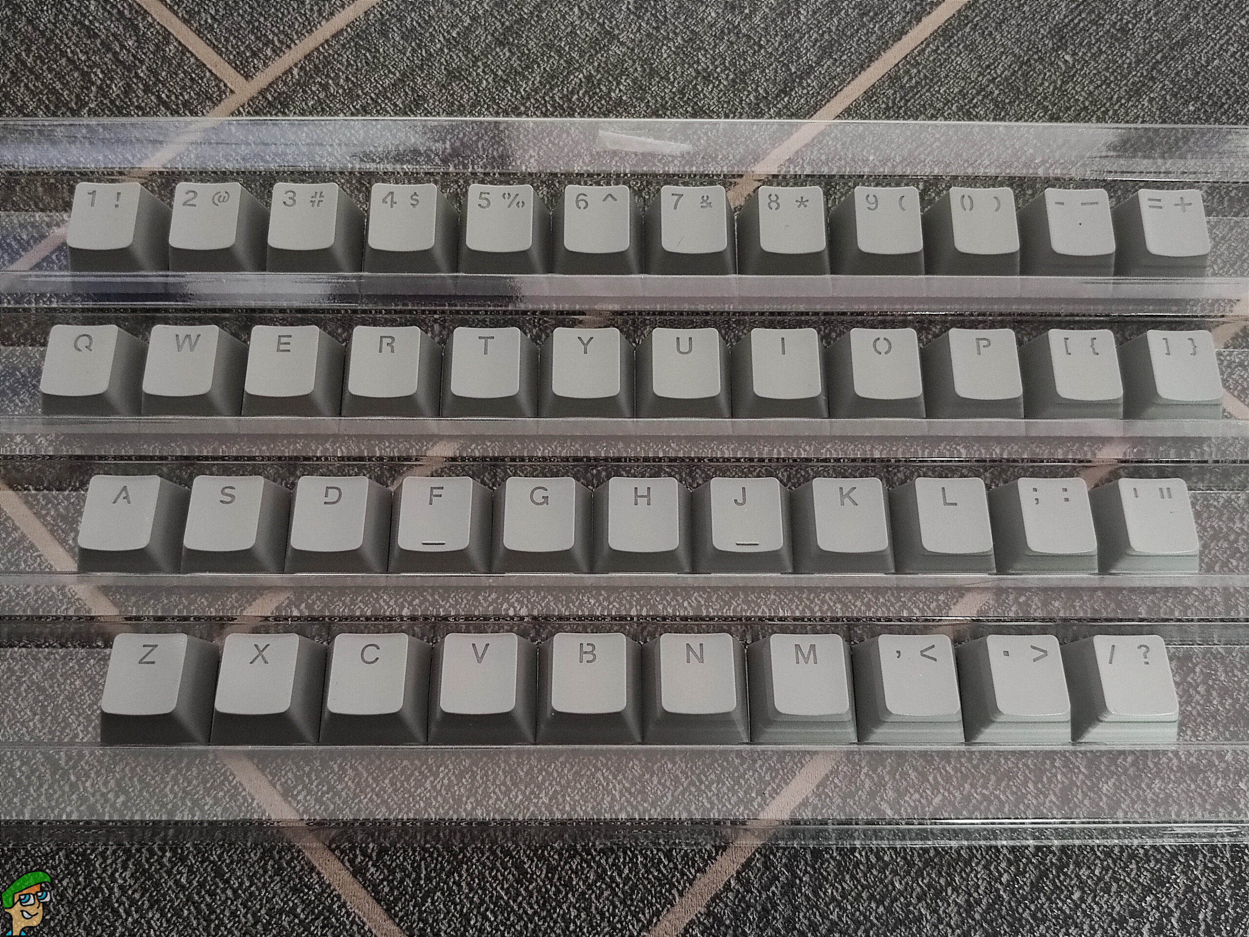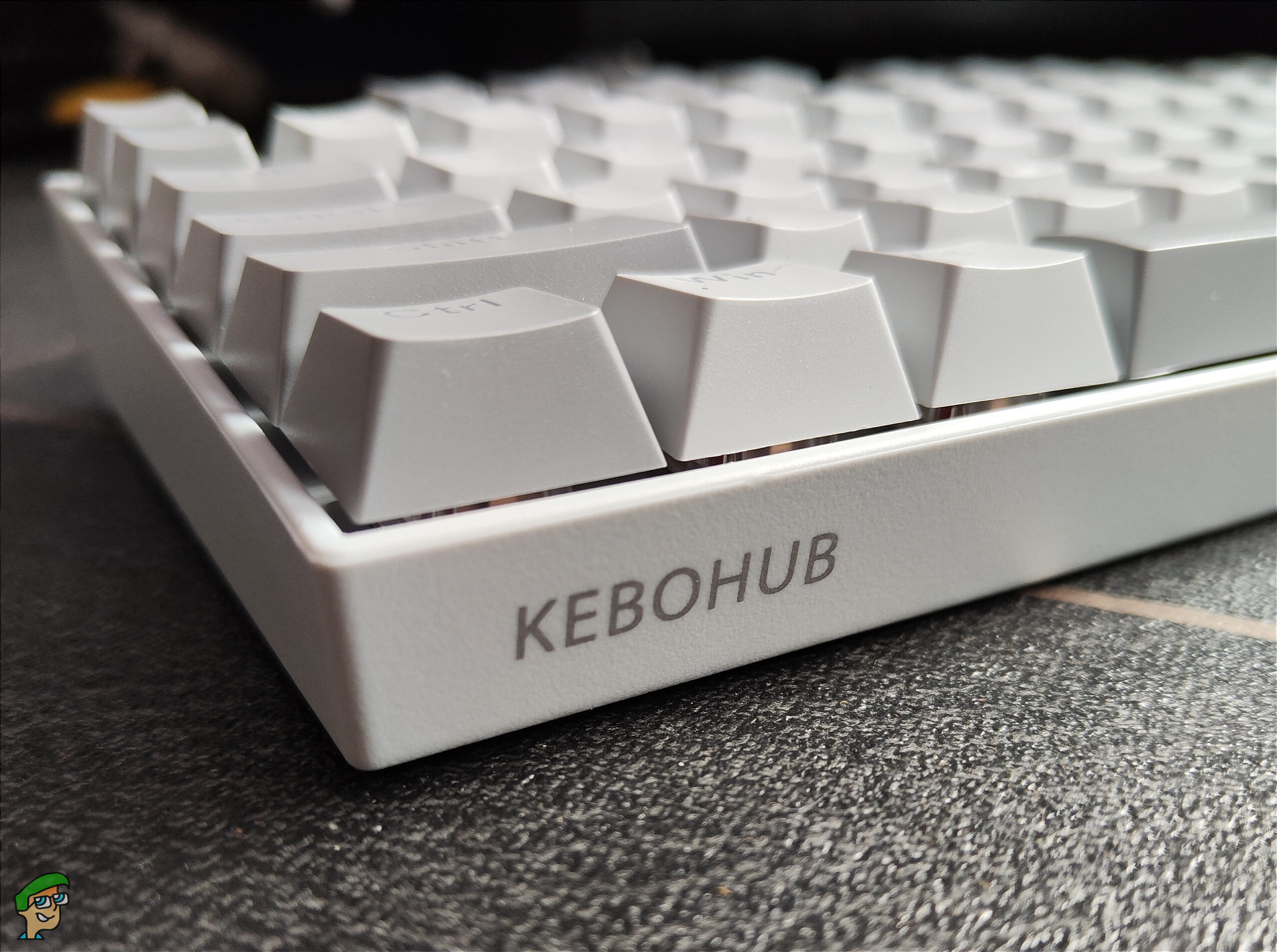 Being light grey almost white and fully matte, this looks very clean and simple. The combination of the white and grey keycaps breaks up the solid colour.