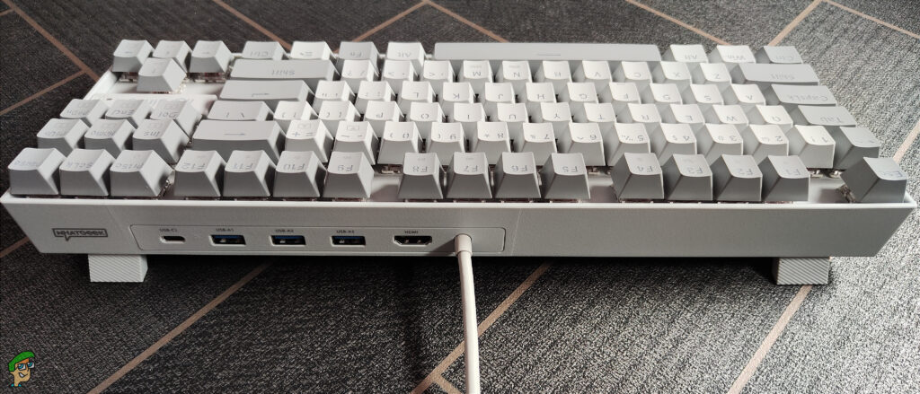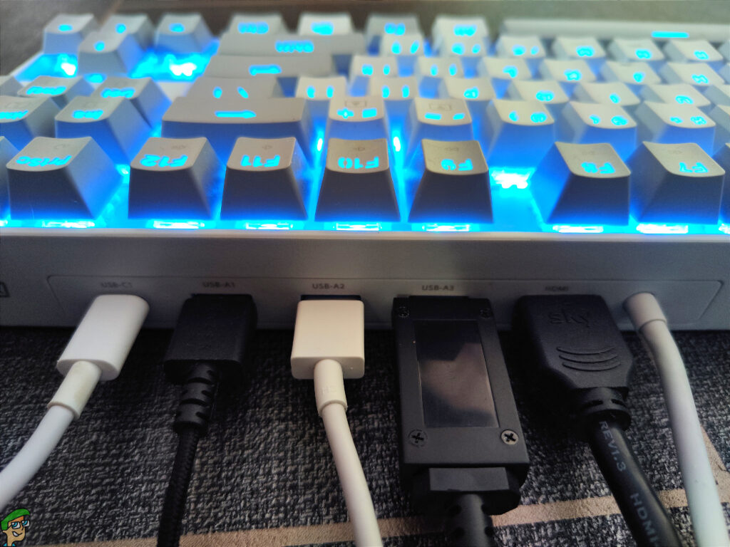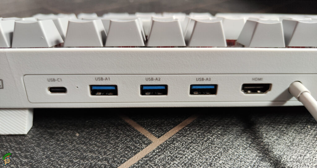 Moving around to the rear of the keyboard is where it gets interesting. We have the expected USB cable, which is a dual-type C rather than a standard single type A and is 165cm in length. Next to this, we have an HDMI 2.0 port, 3 x USB 3.0 type A, and 1 x USB 3.1 type C.