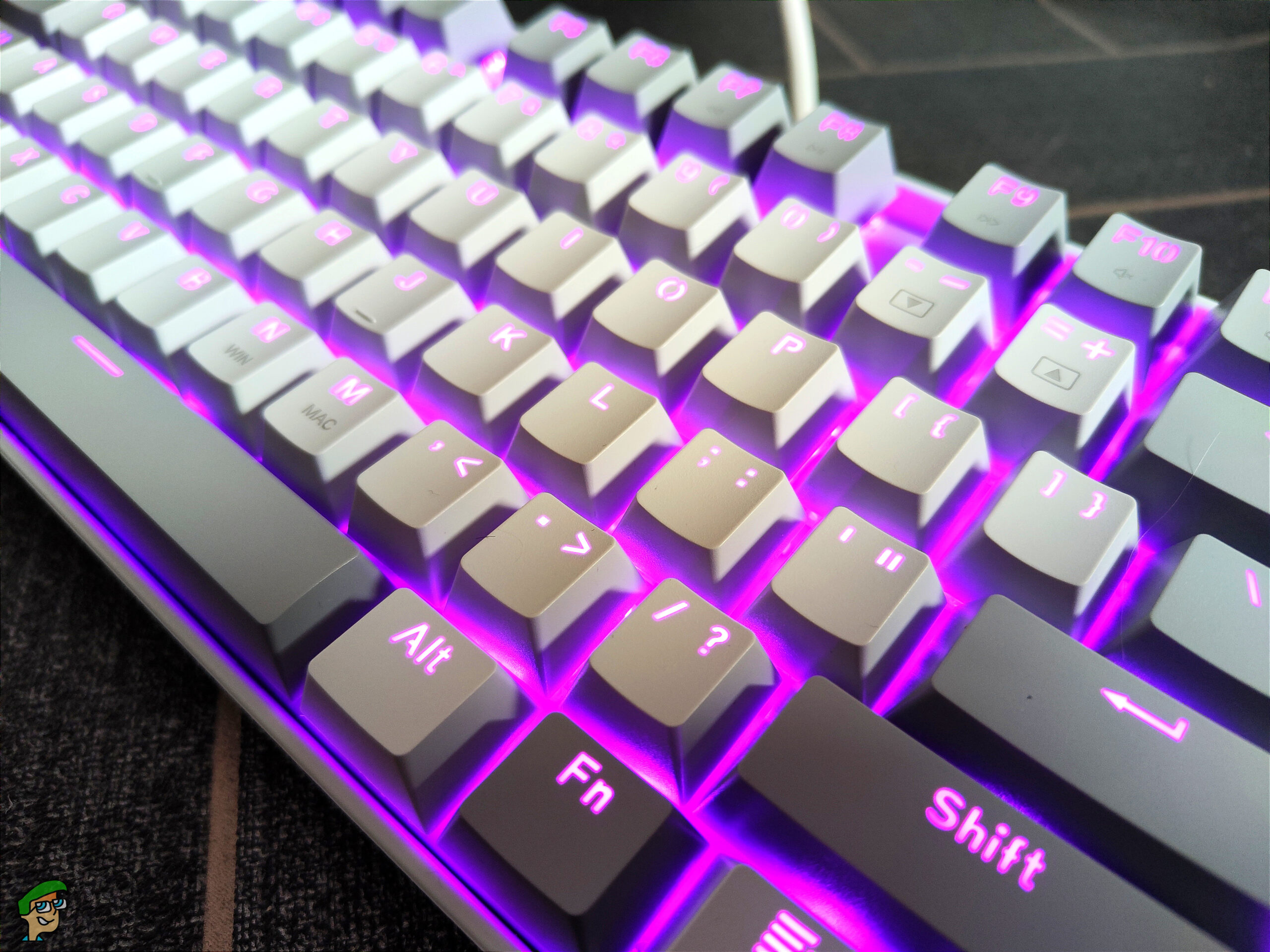 Turning on the PC brings this keyboard to life with a bright colourful rainbow effect. Different lighting effects can be used by simply holding the FN key and hitting the ins/home/del/pgup/pgdn keys. Each of these keys will cycle through 3 different lighting modes for a total of 18 different pre-set effects. Sadly, there isn’t any software available to control this. Something along the lines of iCue (Corsair’s RGB software) would be ideal. No extra drivers are required for this keyboard to work, it is fully plug-and-play. Both grey and white keys are very clearly marked allowing the LEDs to shine through brightly.