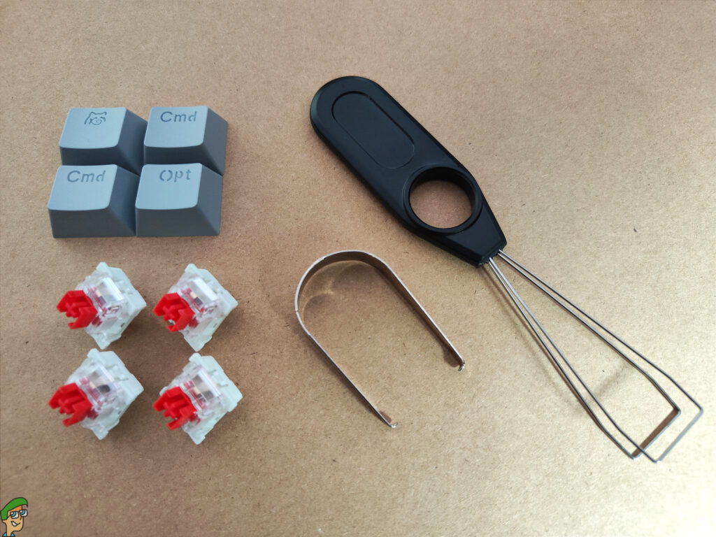 Popping open the plastic box, we have a cardboard insert containing the keyboard and accessories which includes a keycap and switch puller, alternative keycaps for Apple Mac layout, a full set of grey keycaps to switch from the white ones fitted by default, and 4 spare red switches. This keyboard is compatible with 3 and 5-pin switches.