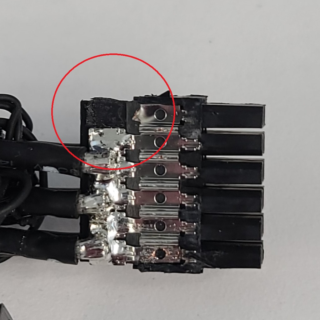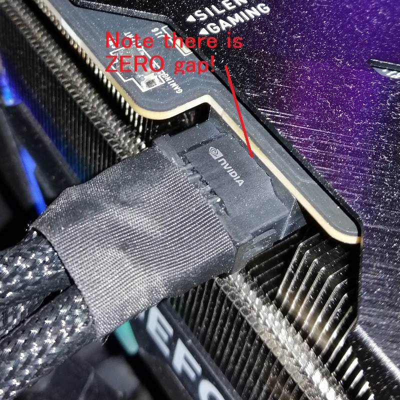Well, how do you insert this connector properly? If there is a small gap between the connector and the GPU, the cable is not inserted properly. The picture below represents a properly inserted connector. Note that it is quite easy to mess up this seemingly easy step because the connector is actually quite hard to plug in properly.