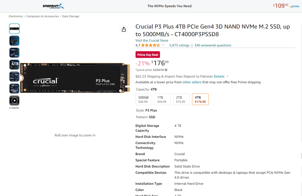 The 4TB P3 Plus from Crucial, boasting blazing fast speeds of up to 5GB/s using the PCIe Gen4 protocol is priced at just $170. This deal is almost unbelievable since the original cost of this SSD, once Prime Day is over, is $225. Better yet, the P3 Plus originally launched for $400 (4TB variant).