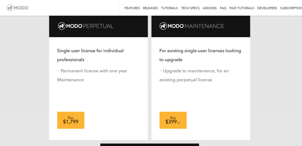 - Modo Individual- This version is divided into three different categories i.e. Modo Perpetual, Modo Maintenance, and Modo Subscription. Modo Perpetual costs $1799 which is a one time cost, the price of Modo Maintenance is $399 per year whereas Modo charges $599 per year for the Modo Subscription.