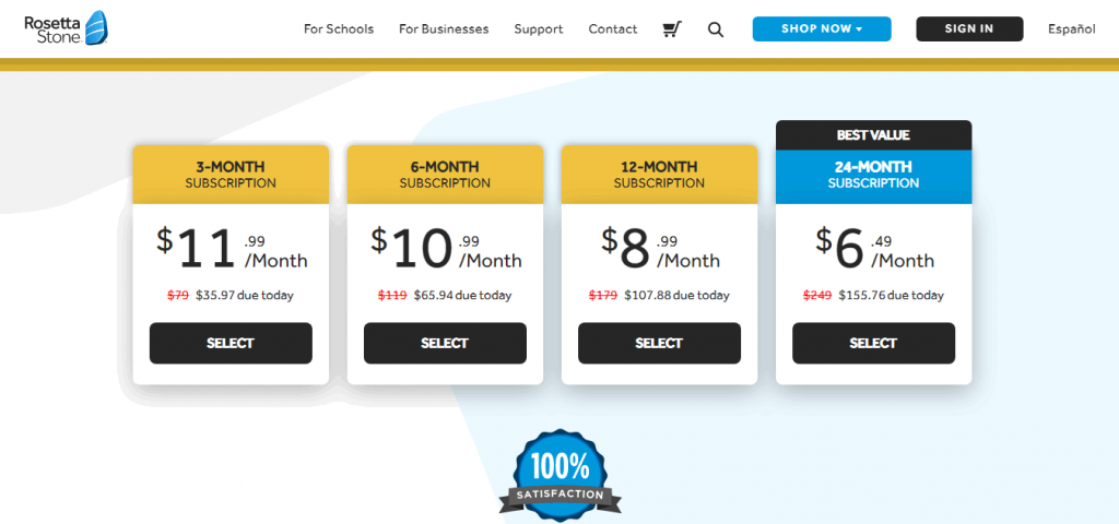 - 24 Months Subscription- Rosetta Stone charges $6.49 per month with $155.76 down payment for this subscription.