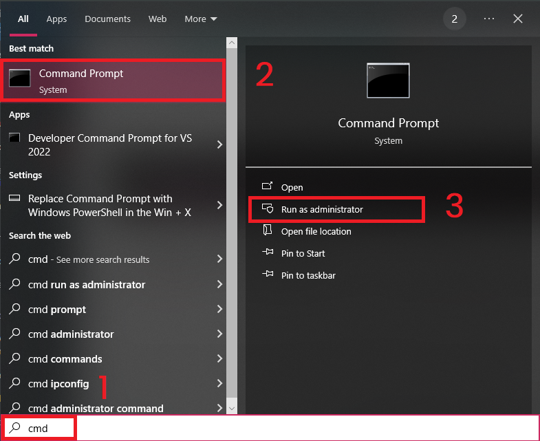 - Search for Command Prompt, right-click, and choose Run as administrator.