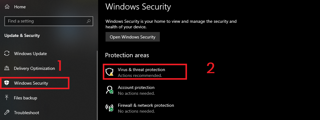 - Go to Update & Security > Windows Security > Virus & threat protection.