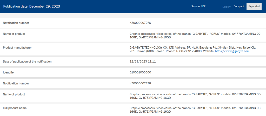 The mentioned RX 7600 XT model is from Gigabyte under the AORUS lineup. Importantly, this registration confirms that the RX 7600 XT will host 16GB of memory, which can be seen in the image. This is a massive 2x increase over the RX 7600 and 4GB more than the faster RX 7700 XT.