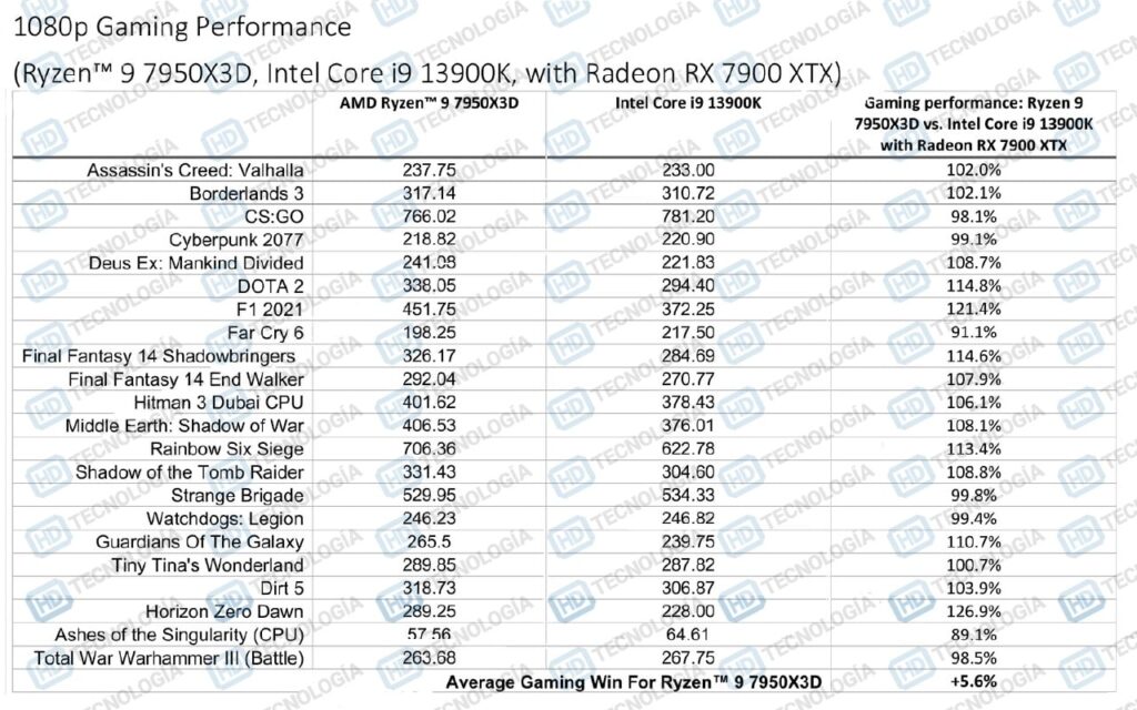 Just now, hd-tecnologia has shared some benchmarks of AMD’s upcoming Ryzen 9 7950X3D. This is a major leak as this is probably the first source to share some actual in-game performance metrics. The benchmarks are said to be official test results from AMD.