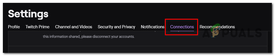 Accessing the Settings menu of Twitch - Once in Settings, click on the Connections tab in the horizontal menu at the top.