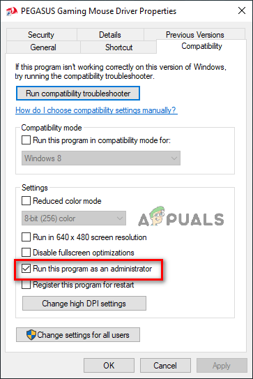 - On the Compatibility tab, check Run as administrator and click Apply.