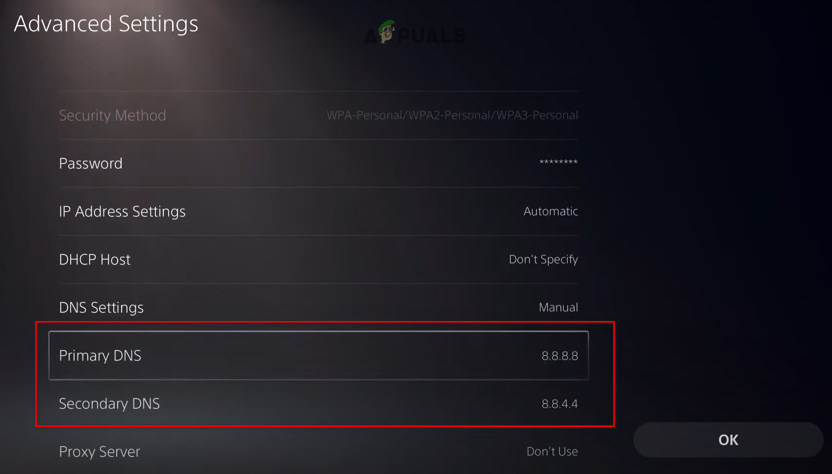 Selecting Advanced Network Settings - Change DNS Settings to Manual, then set Primary DNS to 8.8.8.8 and Secondary DNS to 8.8.4.4.