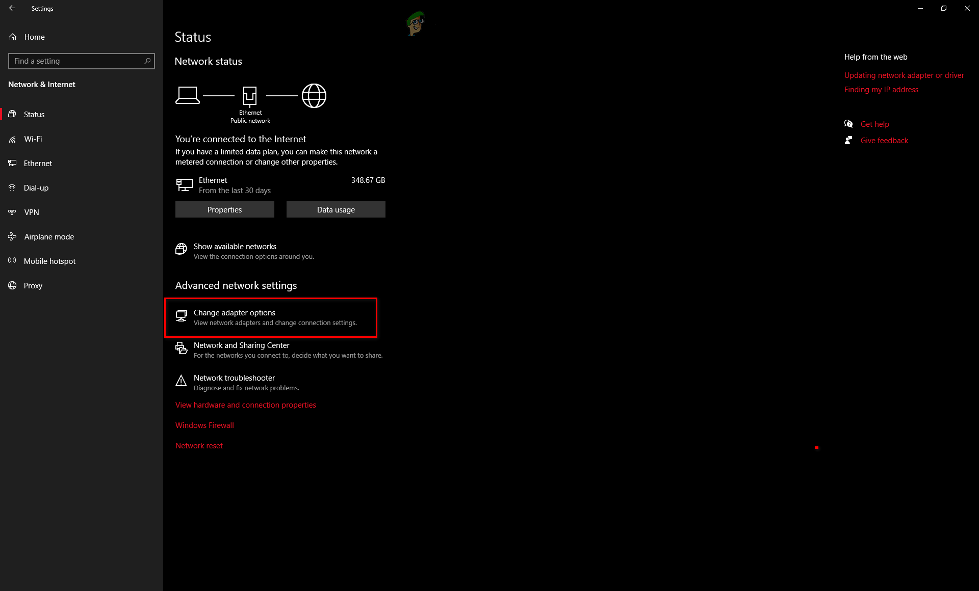 Opening Network and Internet Settings - Click Change Adapter Settings.