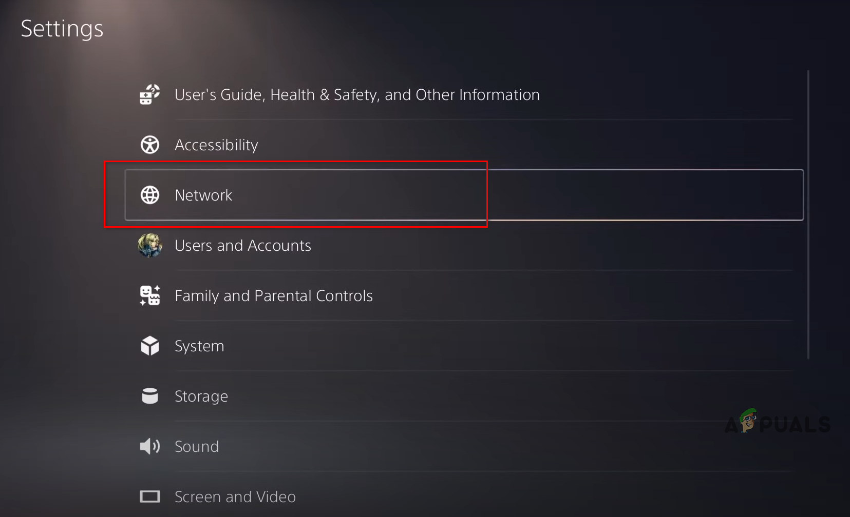 Opening PS5 Settings - Go to Network > Settings > Set up Internet Connection.