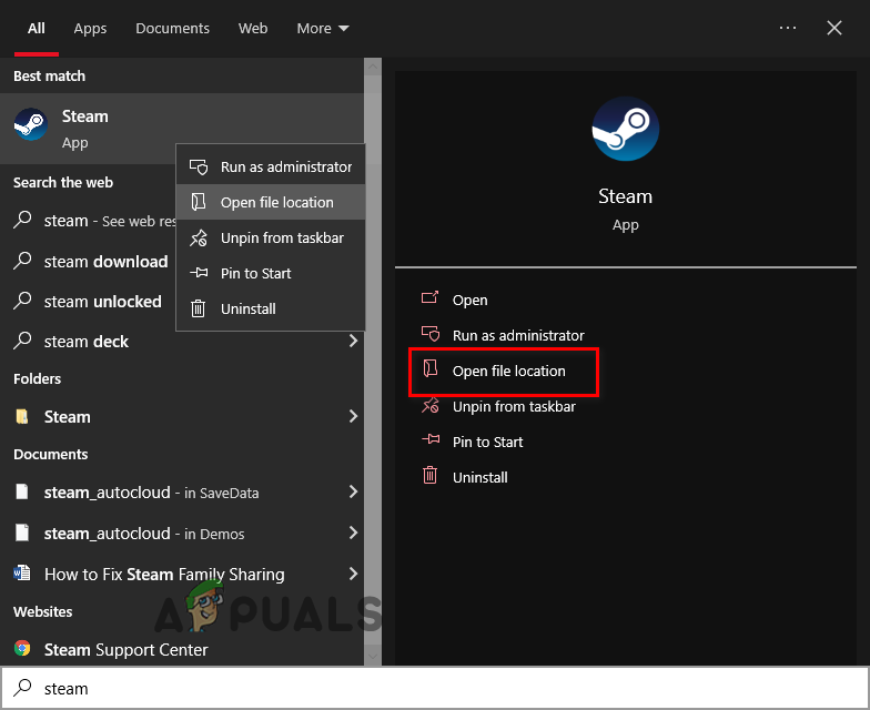 - Right-click Steam and select Open File Location.