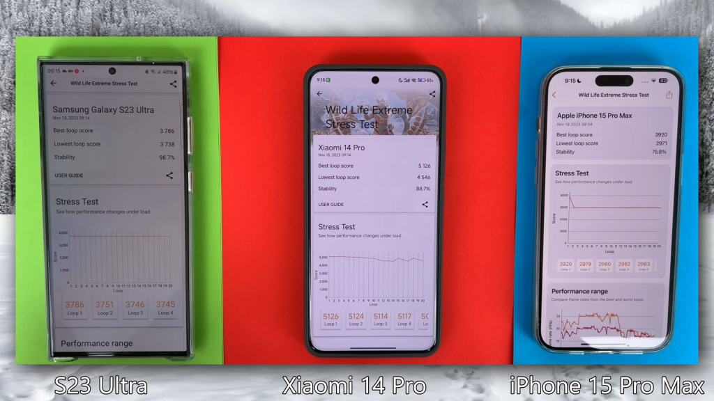 iPhone 15 PM’s overall stability was measured at 75.8%. However, the 8 Gen 3, despite its less optimal cooling solution, achieved a stability of 88.3%. The last-generation overclocked 8 Gen 2 in the S23 Ultra was the most stable at 98.7%, albeit with a lower overall score compared to its successor.