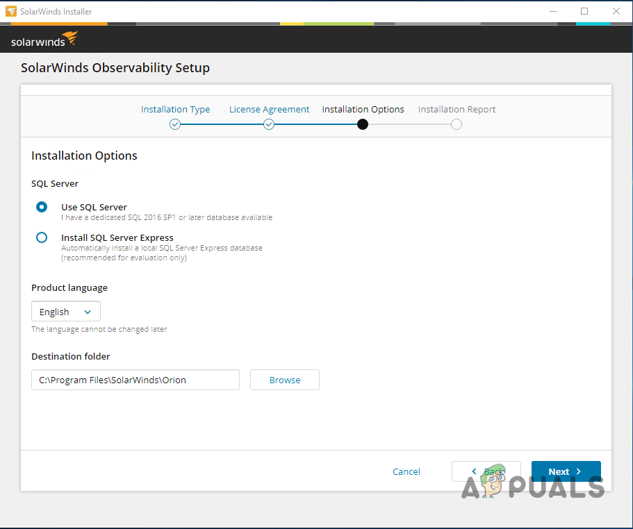 - Then, on the Installation Options, if you wish to use an existing database, keep the Use SQL Server option. In case you wish to evaluate the product, you can opt for the Install SQL Server Express option. In addition to that, select the directory where you wish to install the tool by clicking the Browse button. Finally, click the Next button.