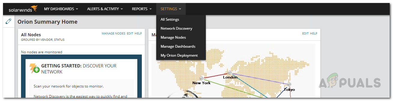 Orion Settings Menu - After that, click on the Add New Discovery option provided to initiate the Network Sonar Wizard.