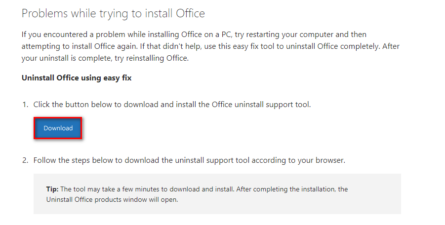 - Next, visit the official Microsoft support page (here), scroll down to the Problems while trying to install Office section, and click the Download button.