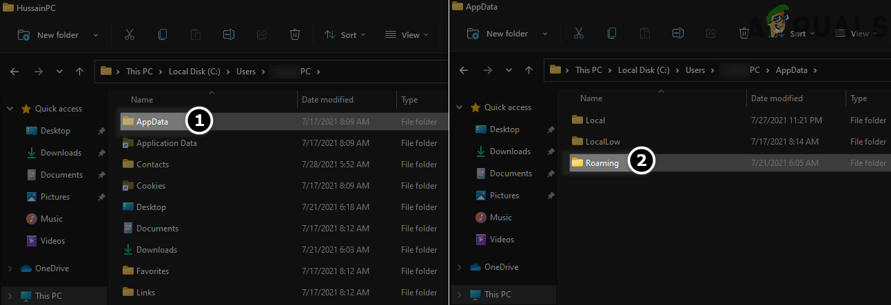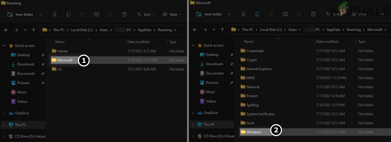 Open the Roaming Folder in the AppData Directory - In Roaming, open the Microsoft directory, followed by the Windows folder.